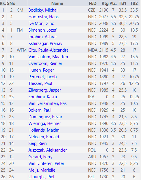 Op Chess-results is bijna alles te vinden. Door een klein indelingsprobleem was de zeven ronde niet meer in te delen in de gezelligheidsgroep. Uiteraard is dat door de wedstrijdleiding opgelost.