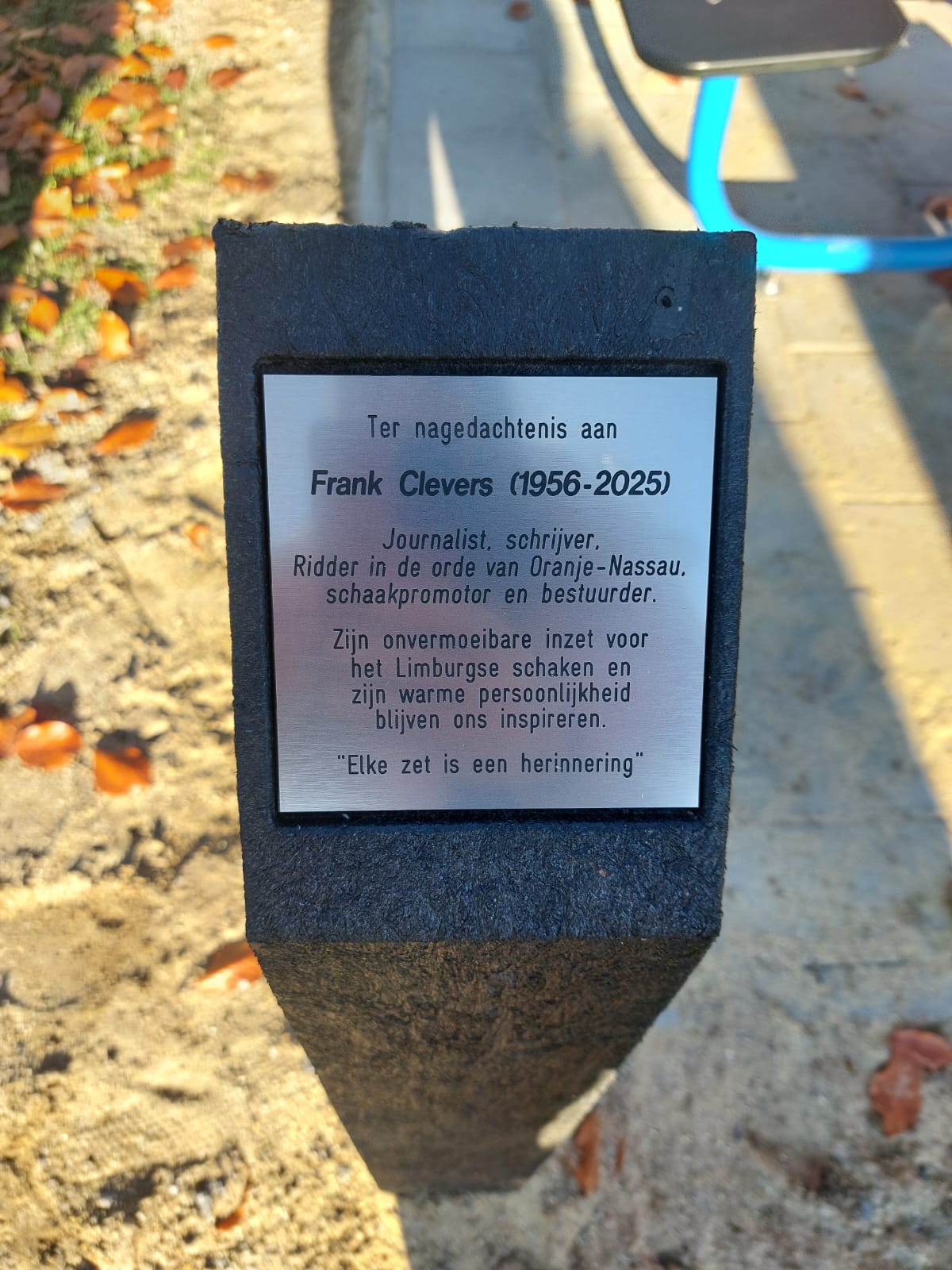 Op 8 november hebben we een prachtige schaaktafel kunnen onthullen op sportpark West in Malberg, Maastricht. Deze tafel is geplaatst ter nagedachtenis aan Frank Clevers. Op deze dag is ook de eerste editie van de Frank Clevers Memorial gespeeld. Je vindt in dit bericht een verslag (MvL), veel foto’s (CH) en uitslagen.