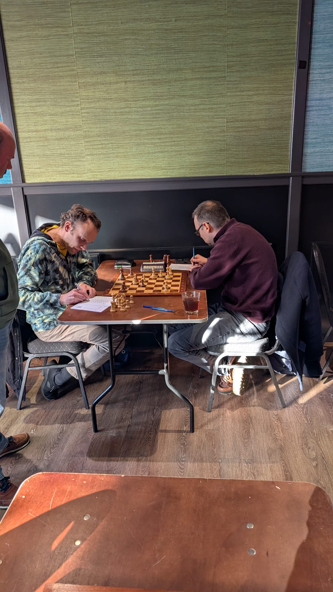 Reinier was niet rustig genoeg aangekomen na de autorit en blunderde in de opening al snel een kwaliteit. Bas speelde tegen Sai (oud-jeugdlid van onze vereniging) en won al snel een pion. Toen Sai nog een keer eenzelfde truc trapte was het min of meer afgelopen. Reiniers tegenstander ging inmiddels voor zettenherhaling. Zo waren de laatste twee borden klaar en stonden 1,5-0,5 voor.