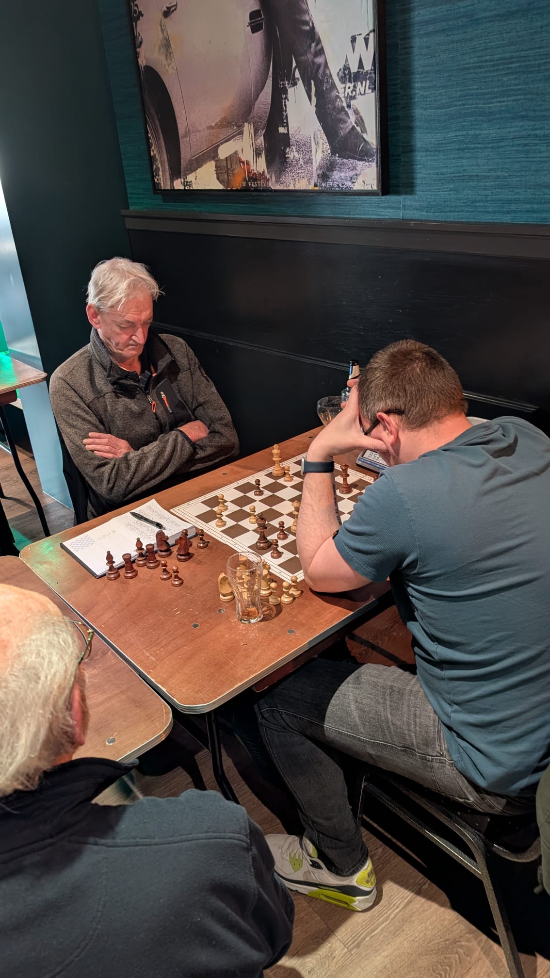 Dan heb je het middenschip van het team over bord 3 tm 6. Op bord 3 zat Ashraf niet lekker achter het bord, druk met werk, een stelling die hij half kende. Nee, het ging niet goed. Max op bord 4 had een Konings-Indiër op het bord. Hele scherpe stelling en er leken we kansen voor Max. Parth op bord 5 bouwde zijn partij heel langzaam op en kwam gewonnen te staan. En Frans op bord 6 had een moeilijke stelling de hele partij lang.
