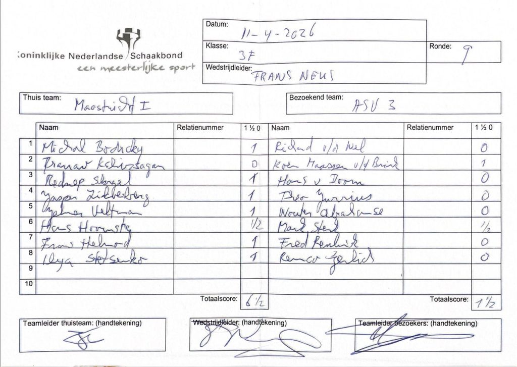 Met een overwinning van 6,5-1,5 op ASV 3 is Maastricht 1 kampioen geworden in de 3e klasse! Een mooie mijlpaal voor de vereniging dat sinds heel lang (30-40 jaar) weer eens in de 2e klasse te bewonderen is.